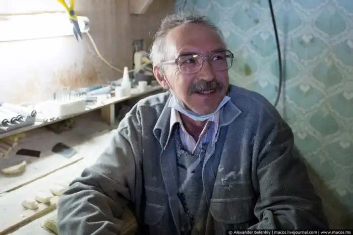 Владимир занимается художественной резьбой пятнадцать лет, но это далеко не единственная его профессия. Сегодня ему 62, и бОльшую часть жизни он был танцором в местном ансамбле. Потом сменил несколько профессий, артисты рано выходят на пенсию. Но нашёл себя именно в этой резьбе. Вспоминает, что мама ему рассказывала о том, как маленьким мальчиком он легко вырезал разные фигурки и оружие из деревяшек. Говорит, что занимается этим делом не столько ради заработка, сколько ради самого процесса и собственного удовольствия. И ещё, чтобы побыть наедине с собой: дома у Владимира целая вереница внуков разных возрастов.