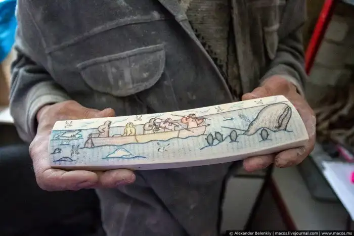 На предыдущей фотографии лишь заготовка, это финальная версия, украшенная национальными сюжетами, выполненными всё из той же моржовой кости. Как вам сувенирчик за 60-70 тысяч рублей? Готовы купить?