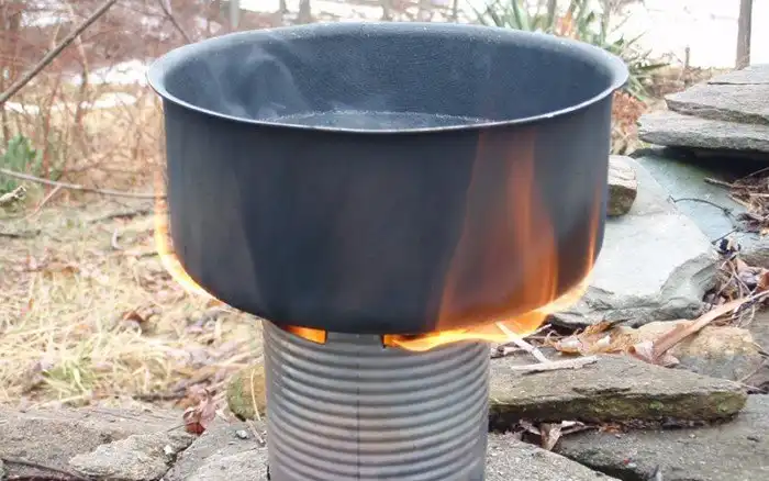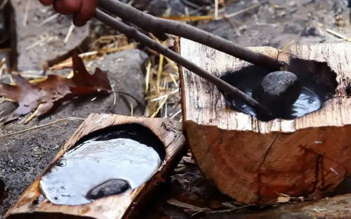 Если под руками нет никакой огнестойкой посуды — накалите в костре камень (сорок минут-час) и бросьте его в емкость с водой.