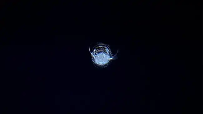 Это скол размером около одного сантиметра. Был сфотографирован британским астронавтом Тимом Пиком внутри модуля "Купол" Международной космической станции. Теперь-то вы уже догадались, скол этот находится на одном из иллюминаторов.