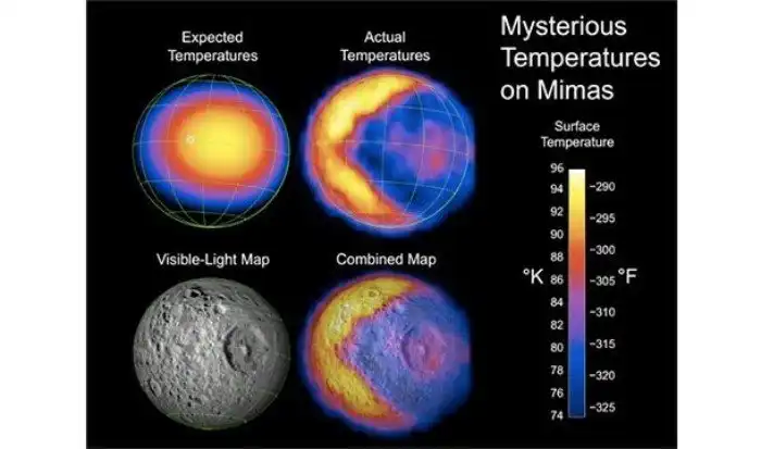 14. Спутник Сатурна Мимас похож на Звезду Смерти, а изображение колебаний температуры на его поверхности напоминает Пакмена.