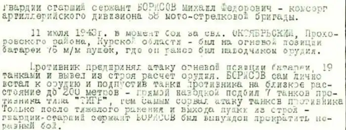 Далее вас ждет история Героя СССР Михаила Федоровича Борисова, который в годы Великой Отечественной войны сумел в одиночку подбить 8 вражеских танков. Борисов остался единственным выжившим из батареи, но, не смотря на это, он сумел дать достойный отпор врагу, остановив его дальнейшее продвижение.