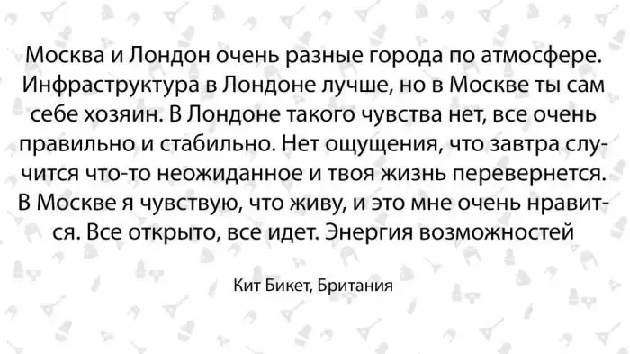 Если политика для британца не имеет большого значения, зато в плане сравнения инфраструктуры и атмосферности Москвы и Лондона, из которого приехал, он рассказывает с удовольствием: