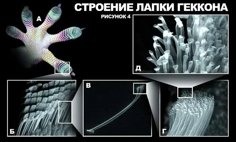 а. Лапка геккона б. "Подушечка" пальца геккона под микроскопом в. Одна из щетинок лапы геккона г. Она же, под бОльшим увеличением д. Максимальное увеличение щетинки