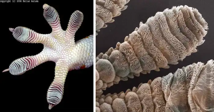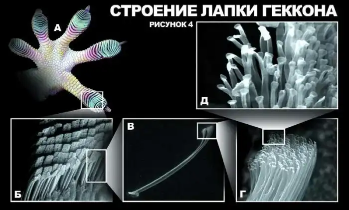 С появлением электронного микроскопа лапу геккона удалось изучить во всех деталях. Как оказалось, она покрыта чрезвычайно тонкими щетинками, длина которых составляет до сотни микрометров. Концентрация щетинок на единицу площади поверхности лапы очень высока: более 14 000 волосков на 1 мм^2. Каждая щетинка, в свою очередь, не является монолитным образованием, а делится на конце на 400-1000 еще более мелких волокон. Толщина таких волокон составляет 0,2 мкм. На 1 см^2 контакта с поверхностью приходится около 2 млрд волокон, каждое из которых к концу расширяется.