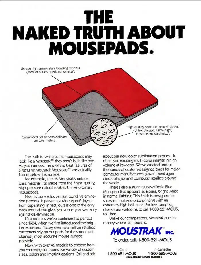 Были и неприятности. В некоторых случаях материал коврика вступал в химическую реакцию с покрытием стола. Это касалось, например, ряда типов лаков для столешниц. Один раз пришлось выплатить тысячи долларов для реставрации стола, лакированная поверхность которого была повреждена ковриком для мыши. После этого происшествия формула материала коврика была изменена.