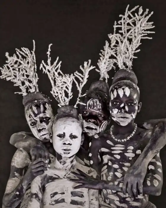 Местоположение: Намибия. Снято в 2011 году. Каждый член племени принадлежит к двум кланам, по отцу и по матери. Браки устраивают с целью расширения богатства. Здесь жизненно важен внешний вид. Он говорит о месте человека внутри группы и о его фазе жизни. Ответственность за правила в группе несёт старейшина.