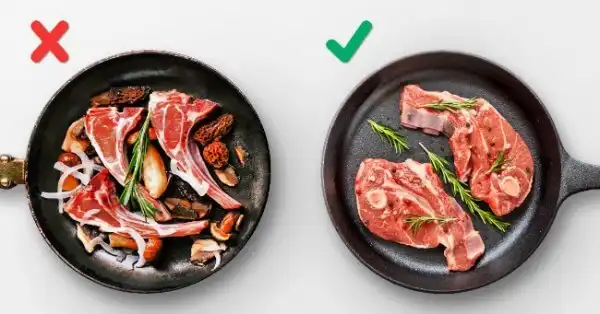 Хрустящая корочка на мясе может не получаться еще и из-за того, что вы используете для жарки сковороду с антипригарным покрытием. Такая посуда нагревается слабее, чем обычная, поэтому ее лучше оставить для омлетов, блинчиков и оладий. Для мяса же используйте сковороду-гриль или чугунную сковороду.