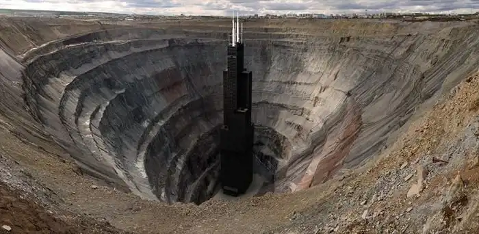 Самая глубокая в мире алмазная шахта "Мир" имеет глубину 524 метра, а это значит, что в нее почти целиком поместился бы небоскреб Уиллис-тауэр - самое высокое здание Чикаго.