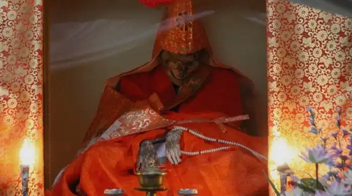 Японский климат совсем не способствует мумификации. Там нет торфяников, безводных пустынь и ледяных альпийских пиков. Лето жаркое и влажное. Тем не менее группа буддийских монахов из секты Сингон открыла способ мумифицироваться путем строгой аскетической подготовки в тени особенно священного пика, расположенного в горной северной префектуре Ямагата. Таким образом они становились воплощениями Будды, живыми богами.