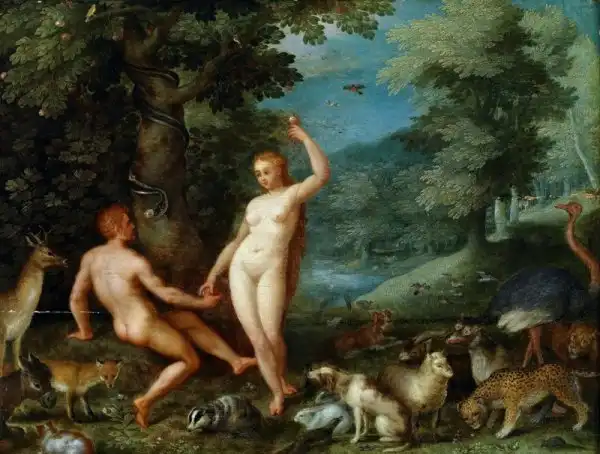 Райский сад, который согласно Библии был первоначальным местом обитания людей. Обитающие в нём люди, Адам и Ева, были, согласно традиционному представлению, бессмертны и безгрешны, однако, соблазнённые змеем, они съели плод с запретного Древа познания добра и зла, совершив грехопадение, в результате чего и обрели страдание. Бог закрыл Рай для людей, изгнал их, поставив на страже Херувима с пламенным мечом.