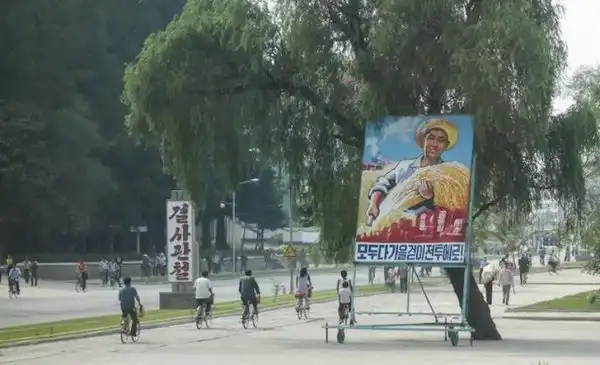 К чему призывает северокорейский крестьянин со счастливым лицом и снопом колосьев в руках? Ну конечно: "Полная концентрация! Полная мобилизация! Все на битву за урожай!" Наши бабушки и дедушки заплачут от ностальгического умиления.