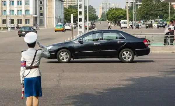 Пхеньянские полицейские не покидают свой пост как раз в тот момент, когда нежданно возникшая пробка настоятельно требует их участия! Правда, до пробки здесь еще далеко, но для Пхеньяна такое движение считается весьма напряженным. А в столь солидной машине наверняка едет видный партиец, достойный отдания чести.