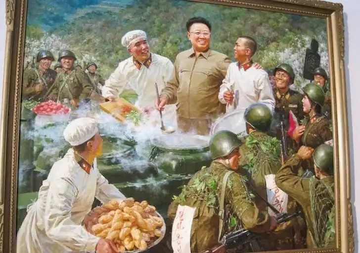 Картина северокорейского художника, на которой Ким Ир Сен от пуза кормит всех присутствующих, называется "Портрет демократии". Глядя на нее, мы видим, как для граждан Северной Кореи выглядит рай: по крайней мере, обилие еды - его непременная составляющая.