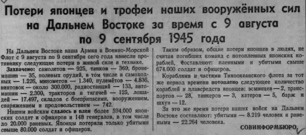 Мы - солдаты, наблюдали, как под конвоем они двигались к Мунданзяну и их мрачные лица уже не обращали внимания на то, как сидят пилотки на наших солдатах, и не на боку ли их пояса. 2 сентября 1945 г. японцы подписали мирный договор. На этом завершилась Великая Отечественная война.