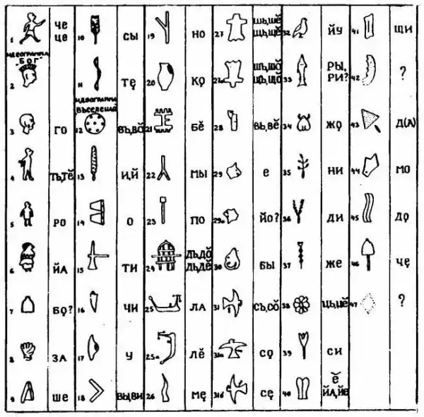 Рассказывает Геннадий Гриневич: " Никто же древним славянским письмом не занимался, никто же эти надписи так и не собрал! Эти надписи, о которых упоминали Е. Классен, Лицееевский, граф Потоцкий и другие, мне удалось расшифровать, считая, что эти надписи выполнены “чертами и резами” (их еще иногда называют славянскими рунами). Вся система была уже до меня разработана. Было известно, что это письмо слоговое, что слоги только открытые, и я сопоставил ряды знаков критской письменности знакам черт и резов, то увидел их значительное сходство. Сведения о том, что этруски были славянским племенем, я почерпнул из словаря Стефана Византийского, где говорится о том, что “этруски - это словенское племя”... Официальная наука считает, что в этрусском словаре существует 28 букв. У меня же получилось - 67. После того как мы озвучили эти знаки, мы просто начинаем читать эти тексты. И если идет нормальная славянская речь, берем словарь праславянского языка, составленный Трубачевым, или древнерусский словарь, или словарь Востокова старославянского языка, и мы находим эти слова не в греческом словаре, не в китайском, а в славянских словарях, и переводим этот текст... Фестский диск - это, получается, более возвышенное такое письмо, когда линейный элементарный знак облекался в форму рисунка... эта традиция сохранялась впоследствии... вот например, когда у нас уже было книжное дело на Руси, когда мы писали кириллицей, заглавные буквы могли изображаться в виде рисунков, например, в виде какого-то чудища... и вот, на Фестском диске из рисунка можно вычленить тот линейный знак, который и положен в основу каждого рисунка. Я прочитал Фестский диск за одну ночь - 23 апреля 1983 г., подъем был необыкновенный. В это время у меня как раз родилась внучка. Наши предки оказались на Крите не по своей воле. В 60-е г.г. был такой известный археолог Брюсов, который, описывая исход трипольцев из Триполья (он делал доклад об изгнании русов) давал возможную трактовку этих событий, и вот, изгнание русов и появление их на чужой земле, на которой они теперь вынуждены обустраиваться, но тоскуют по-прежнему о своей родине - Рысиюнии (или Росиюнии), это очень сходилось с представлениями Брюсова. И я впервые получил при своей расшифровке конкретный исторический сюжет..."