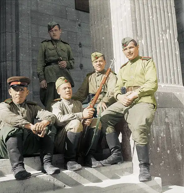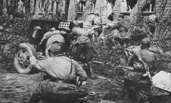 Пехотинцы из 3-й гвардейской танковой армии атакуют противника в Берлине при поддержке пушки ЗиС-3.