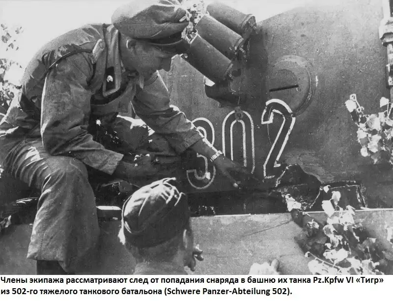 Два огромных танка с крестами на бортах надвигались на батарею. Когда до одного из орудий оставалось не более 50 метров, прозвучал выстрел. Бронебойный снаряд весом 25 кг со скоростью 800 м/с врезался в башню головного «Тигра», которая, расколовшись, слетела с танка. Сильные удары крупных осколков башни по броне второго «Тигра» заставили его экипаж бежать, не заглушив двигателя».