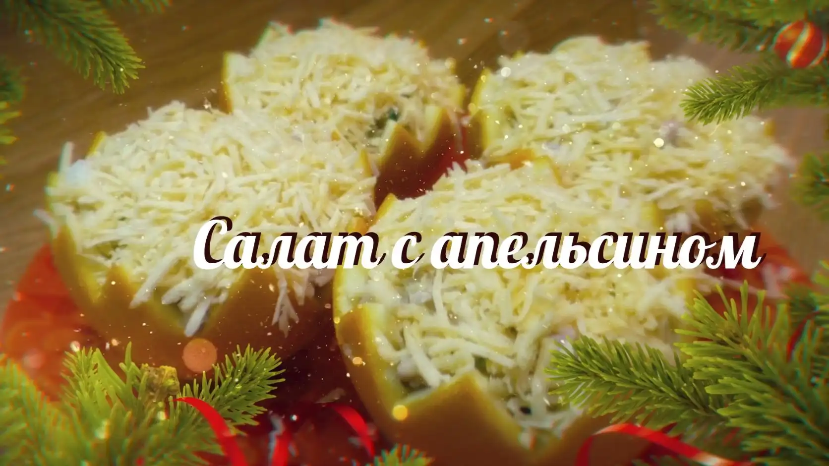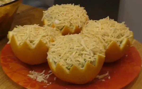 Салат заправляем майонезом и перекладываем его в половинки апельсина.