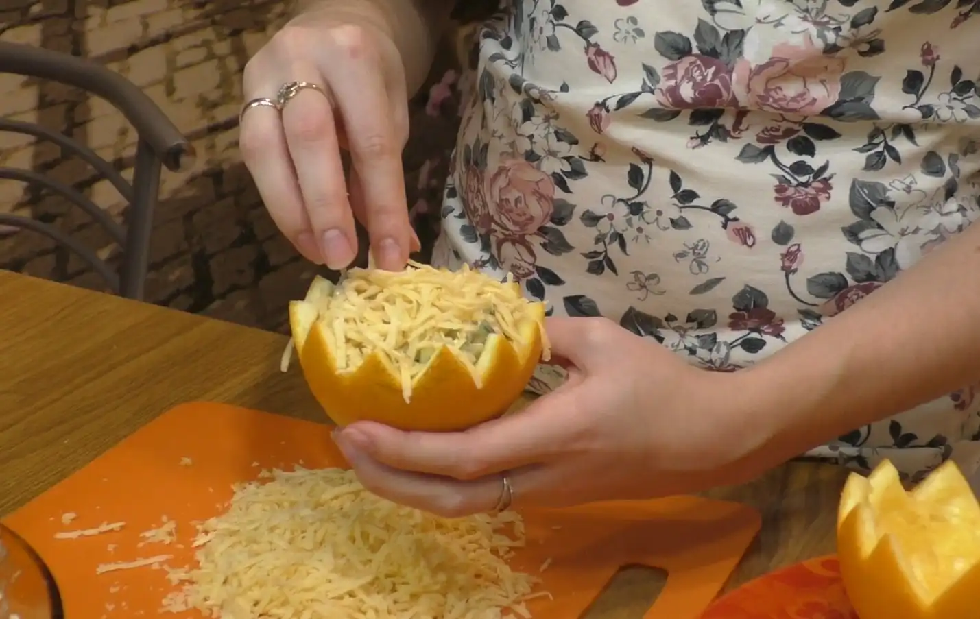 Теперь, разрезаем апельсин на две половинки и аккуратно удаляем из него всю мякоть.