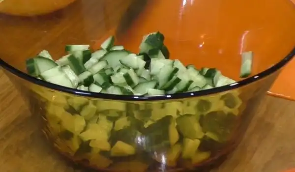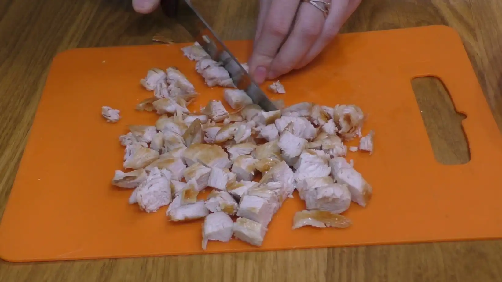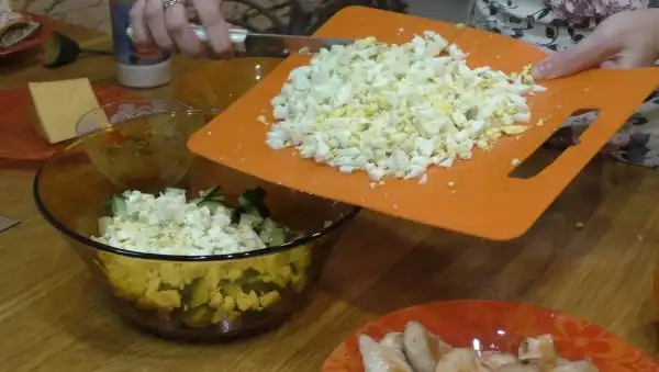 Остывшее куриное филе разрезаем на небольшие кубики и отправляем в салатницу.