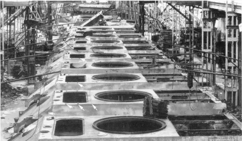 Фото: Линия сборки корпусов танка «Пантера» на заводе компании Ruhrstahl, захваченном войсками союзников. Весна 1945 года. Видны как минимум четыре корпуса для машин модификации Ausf. F. Стрелками показаны видимые отличия от корпусов «пантер» Ausf. G