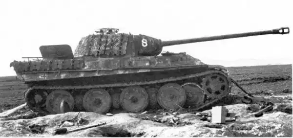 Фото: Танк «Пантера» Ausf. G, подбитый войсками 3-го Украинского фронта. Венгрия, март 1945 года. Бортовые экраны отсутствуют, как и у машины, изображенной на предыдущем фото (фото из архива В. Чурова)