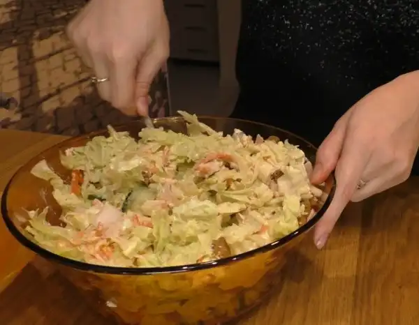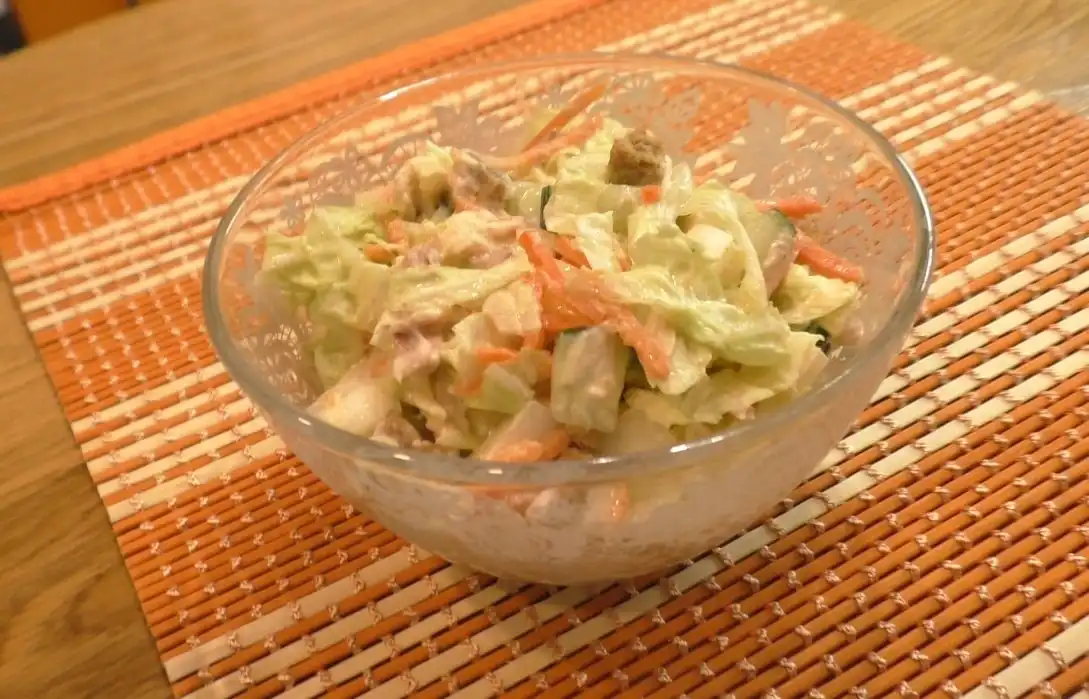 Чтобы сухарики не размокли в салате, добавлять их стоит перед употреблением.