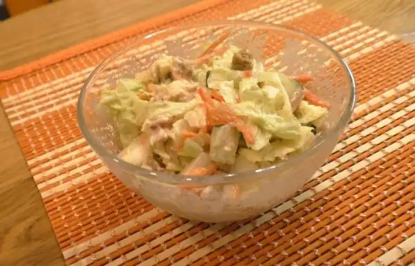 Все перечисленные ингредиенты нужно порезать кубиками, немного подсолить, заправить соусом из майонеза с чесноком и хорошо перемешать.