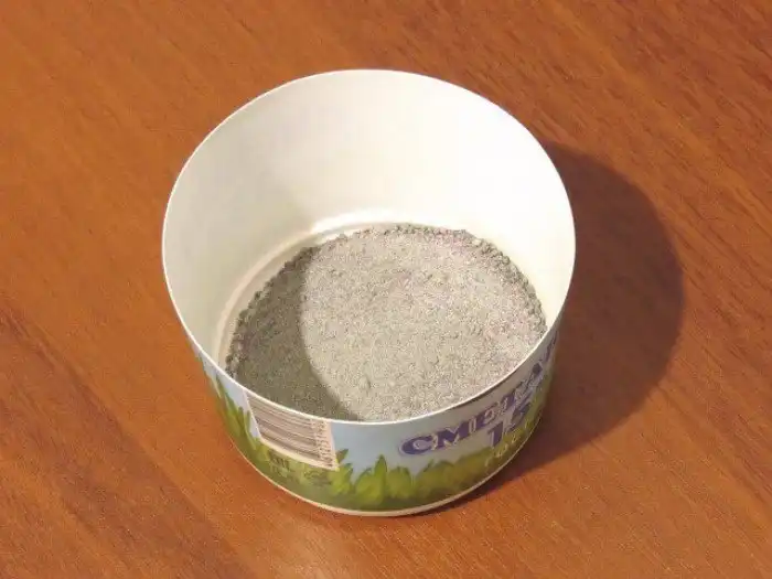 6. Засыпаем песок в одноразовую емкость, я отрезал пустую тару от сметаны, главное дно, оно должно быть плоским, без лишнего рельефа.