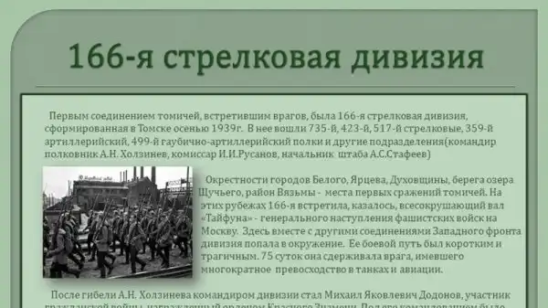 22 июня 1941 года дивизия находилась в летних лагерях под Юргой. В спешном порядке подразделения дивизии были возвращены в Томск, получили новое обмундирование, оружие, боеприпасы и переброшены на смоленскую землю. К середине июля 166-я стрелковая дивизия, входившая в состав сибирской 24-й армии (генерал-лейтенант С.А.Калинин, с 19 июля генерал-майор К.И.Ракутин), заняла оборону на рубеже Белый - Дорогобуж - Ельня. Сибирякам предстояло принять на себя удар фашистских войск группы «Центр», рвавшихся к Москве.