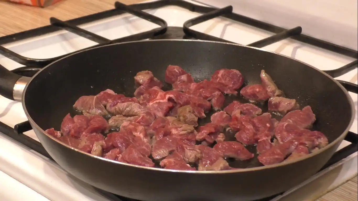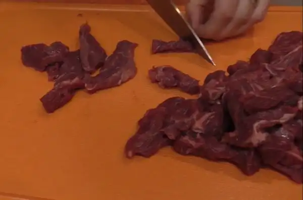 Мясо нужно порезать тонкой соломкой и обжаривать в растительном масле на протяжении 2-3 минут.