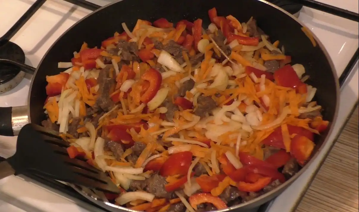 Нашинкованные овощи добавьте к мясу, из которого уже выпарилась вся вода, плесканите в сковороду ещё немного растительного масла и оставьте все обжариваться до полной готовности овощей (примерно 10 минут).