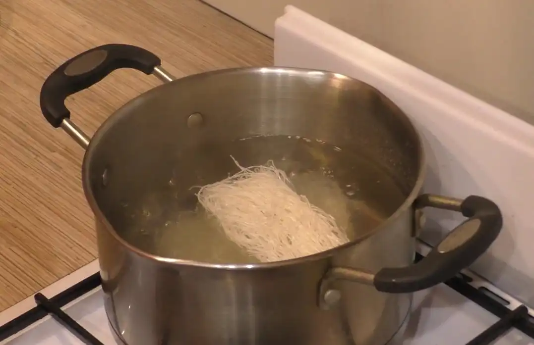 Некоторые люди отмачивают эту лапшу в холодной воде, но это долгое и совершенно ненужное занятие, так как фунчозу можно приготовить и другим, более быстрым и привычным способом, а именно отварить её в кипящей воде.