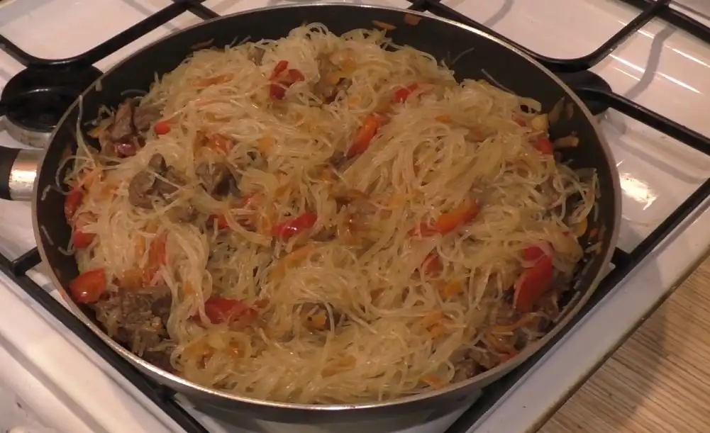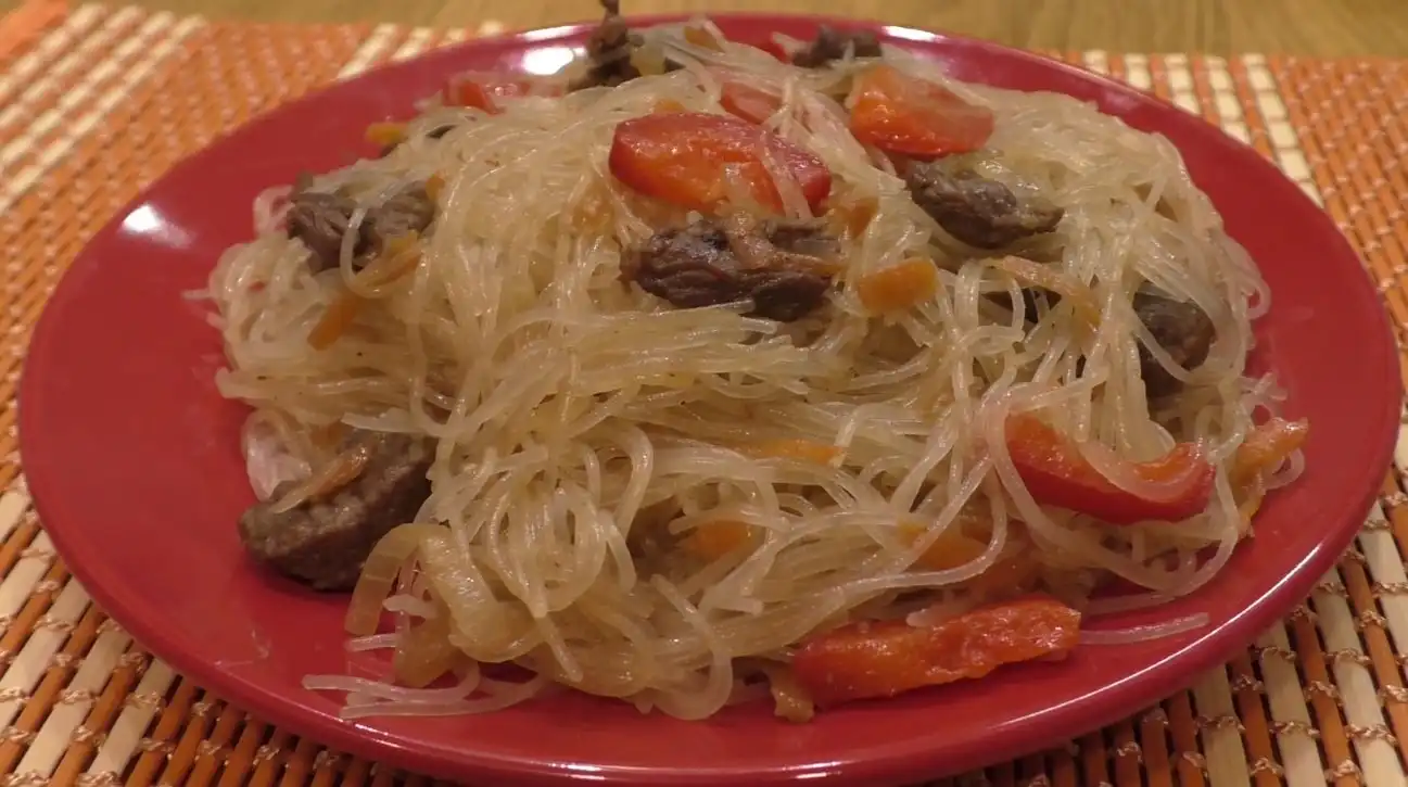 Варится фунчоза в точности как обычные макароны, вот только время её приготовления составляет ровно три минуты. По истечению этого срока, нужно немедленно слить воду и добавить готовую фунчозу к мясу с овощами.
