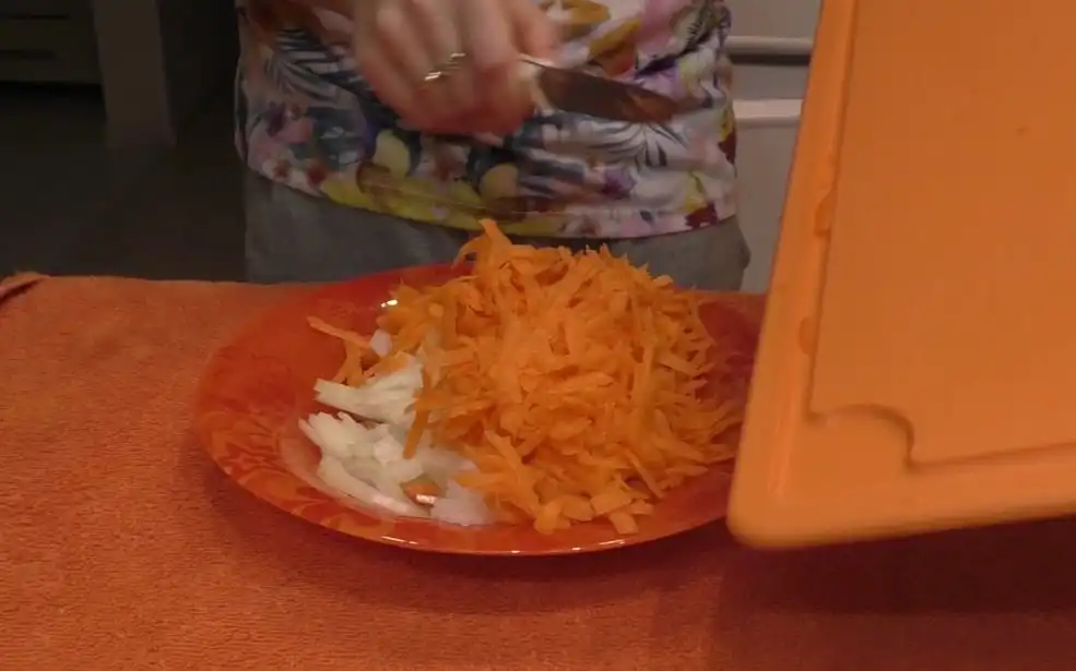 В это время займитесь овощами. Порежьте свежий лук полукольцами, а морковку и болгарский перец соломкой.