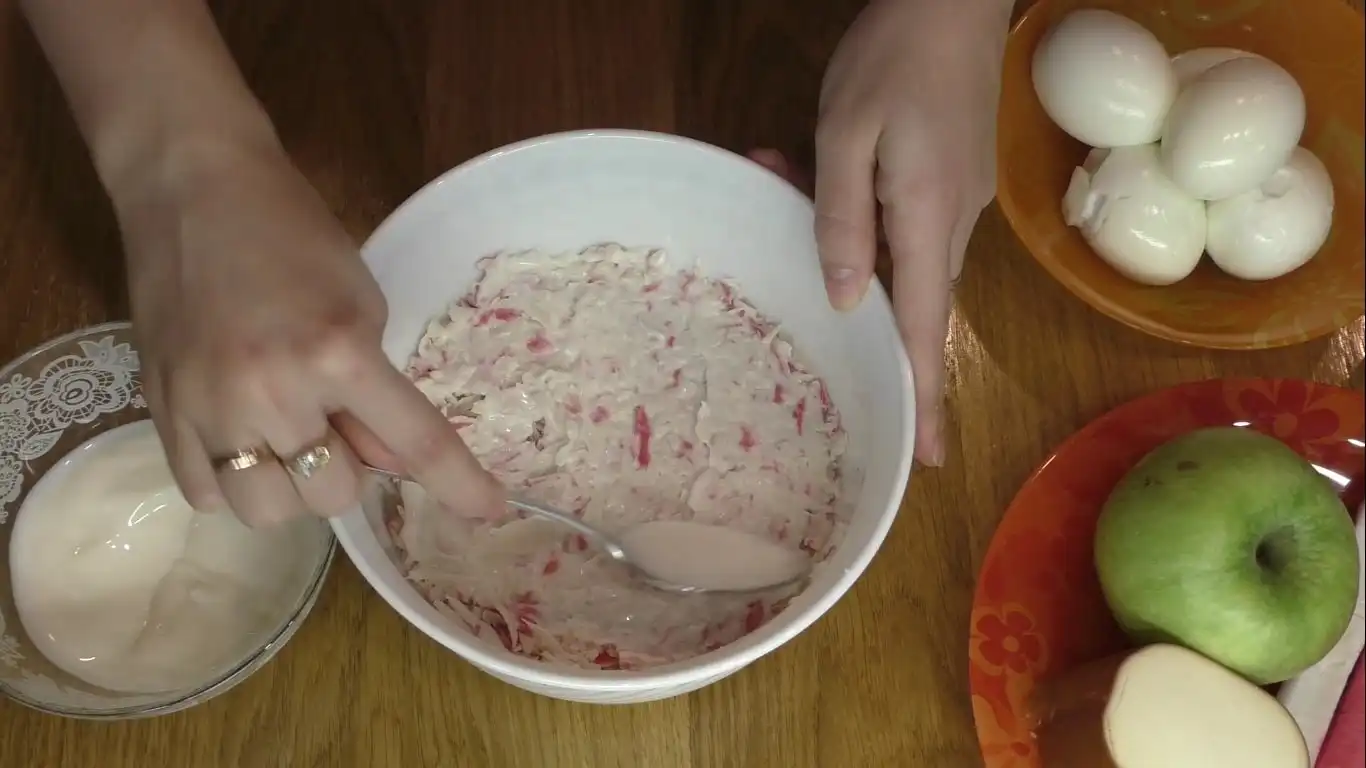 Сначала белок, потом желток. Не забываем про майонез. Кстати, эти слои можно подсолить.
