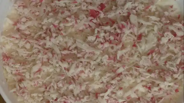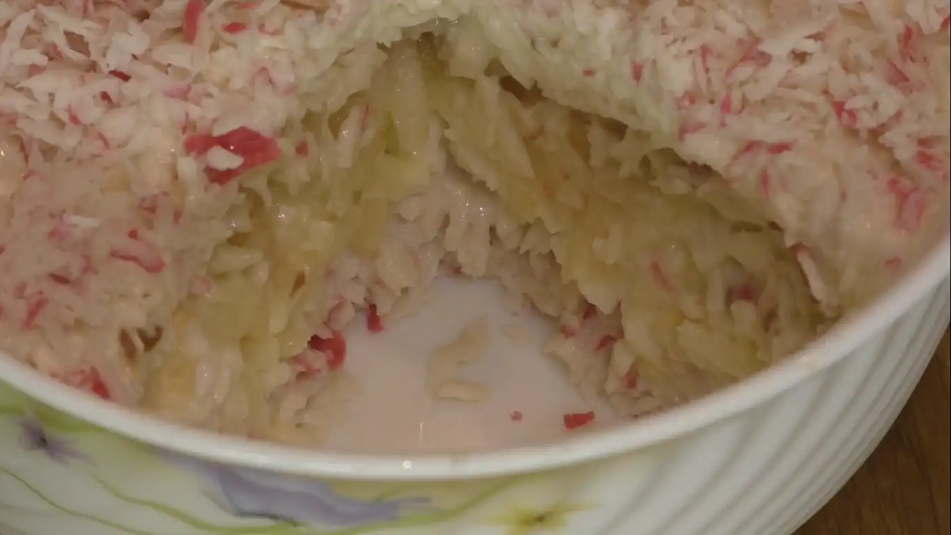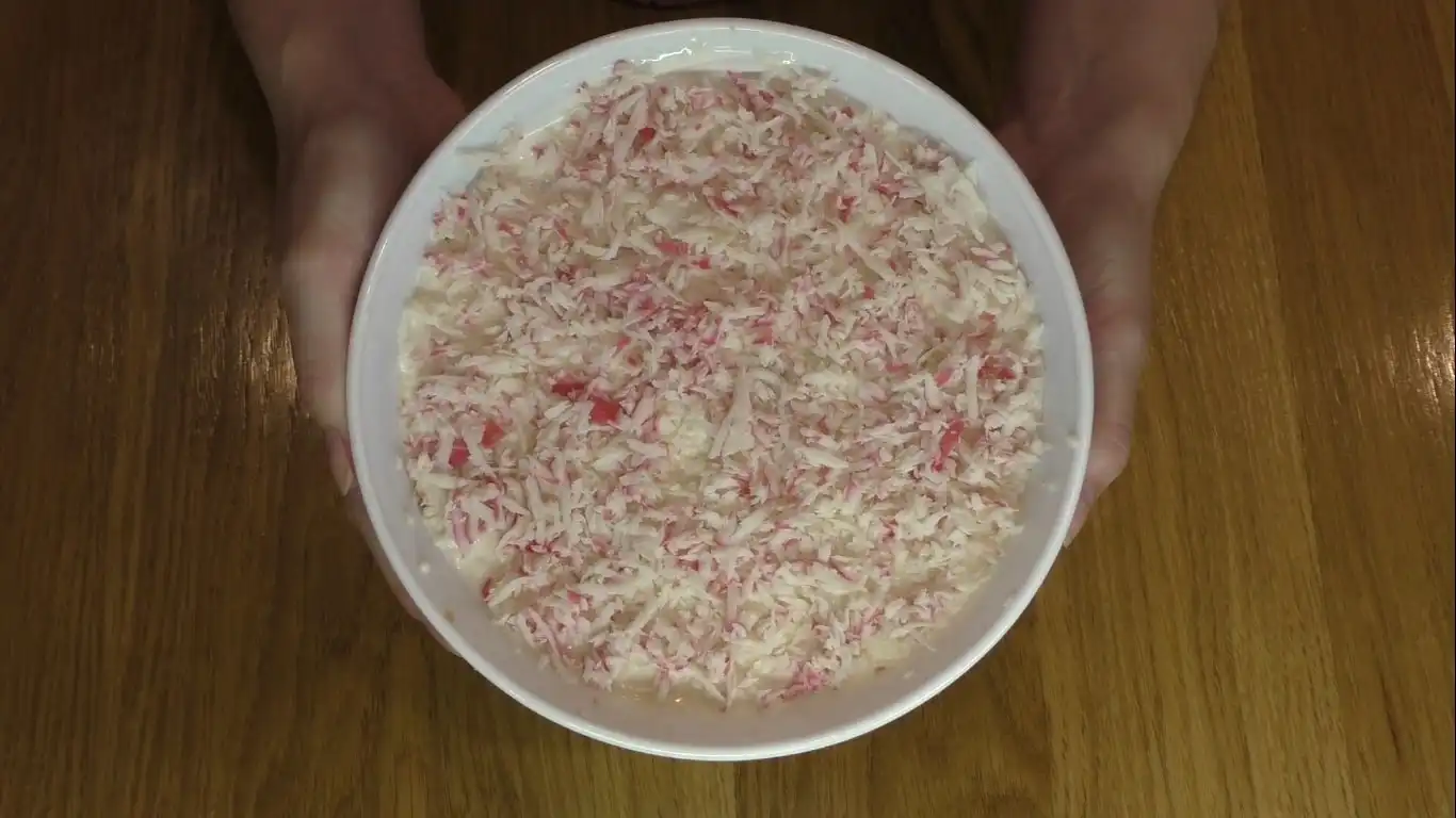 Выкладываем первый слой из протертых на терке крабовых палочек. Промазываем майонезом.
