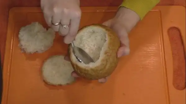 7. Займитесь приготовлением булочек. Для этого аккуратно выньте из них весь мякиш, как показано на фото.