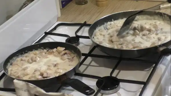 6. После того, как вы размешали муку, сразу же вливайте молоко или сливки, хорошо размешайте и оставьте блюдо томиться до загустения соуса.