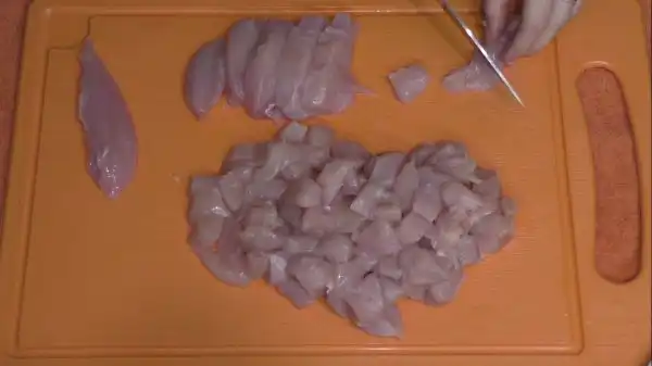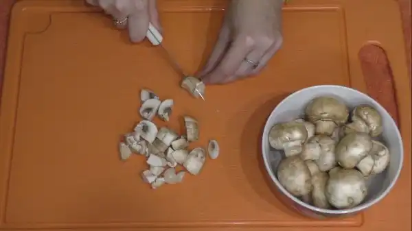 2. Пока куриное филе готовится, нарежьте грибы небольшими кубиками.
