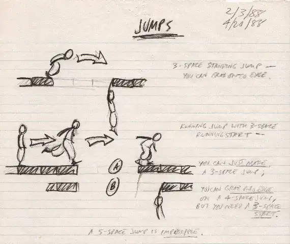 Вот одна из многих зарисовок, которые Джордан сделал во время разработки. Тут объясняется механика прыжка. Пацан может прыгнуть на 2, 3 или 4 "дольки", но никак не на 5: