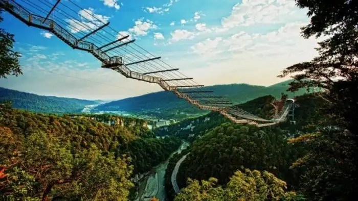 Мост SkyBridge находится в Ахштырском ущелье над рекой Мзымта. Скайбридж - самый длинный подвесной пешеходный мост в мире, длина 439 м, высота 207 м.