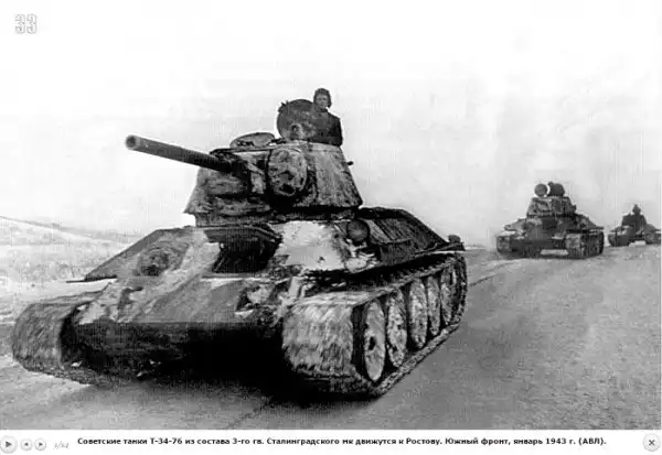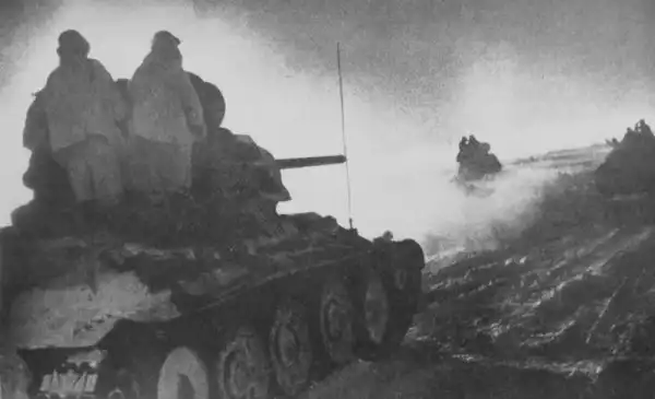 На фото: Советские танки Т-34 с солдатами на броне на марше в заснеженной степи во время Среднедонской наступательной операции.