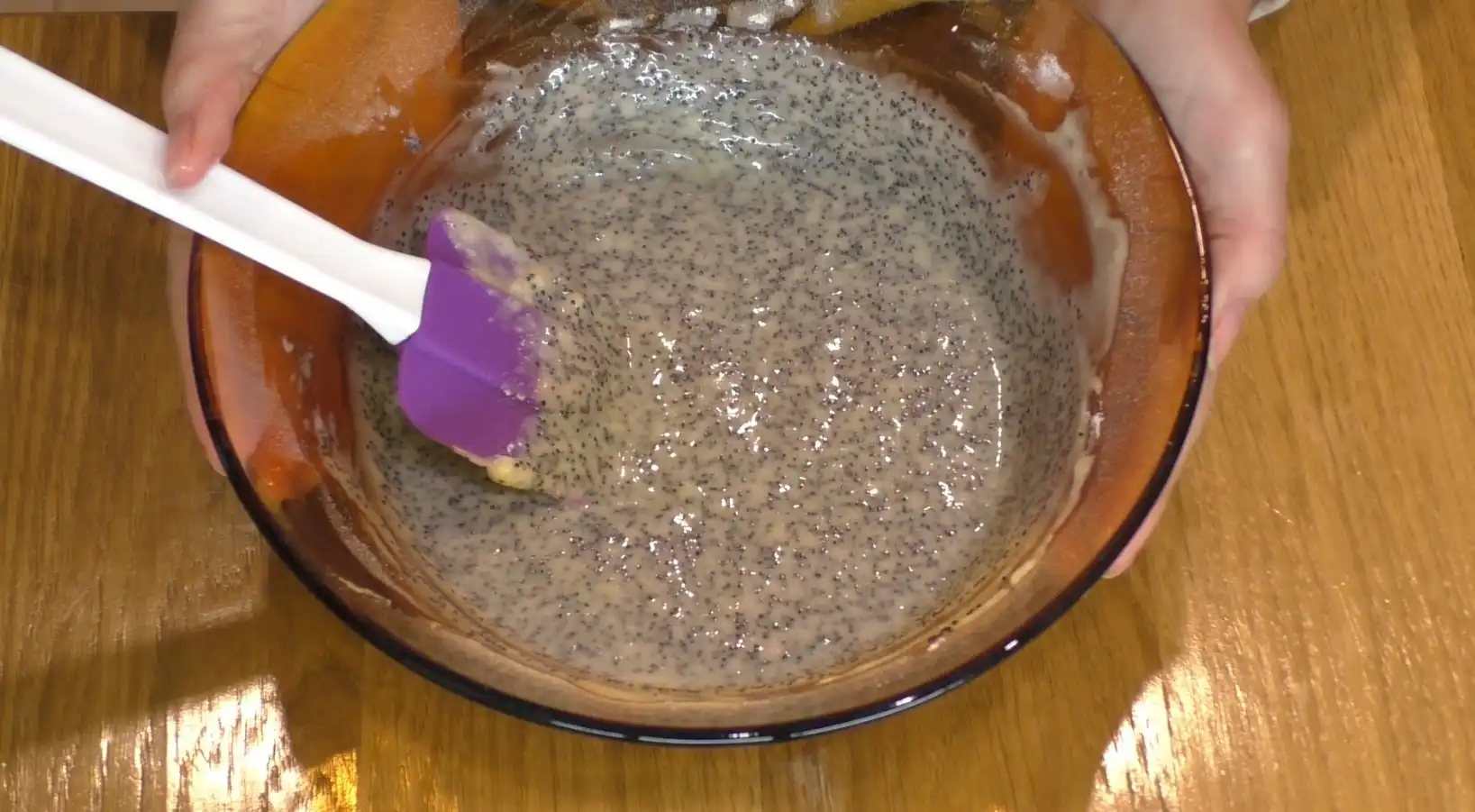 Теперь время добавлять в тесто различные наполнители. Для первого коржа добавьте 50 грамм мака и все хорошо перемешайте.