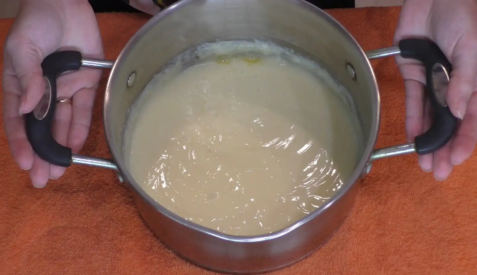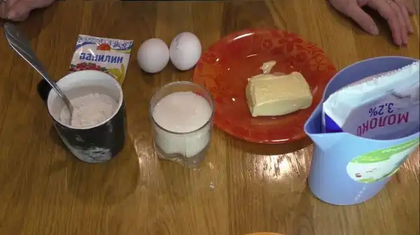 В полученную массу нужно тонкой струйкой влить молоко и при этом взбивать все миксером или венчиком.