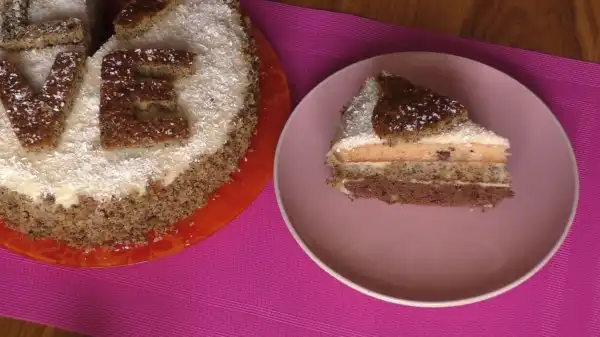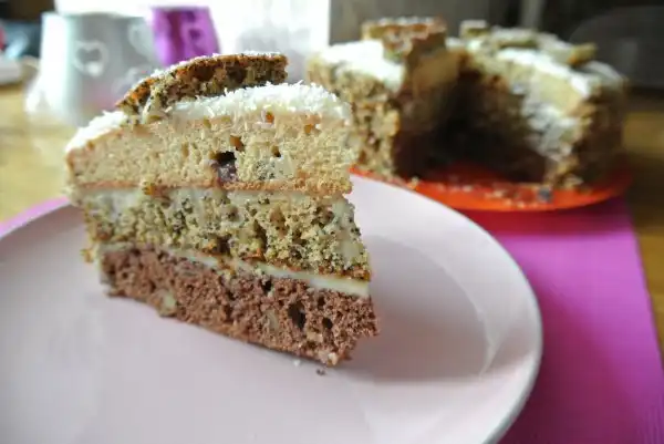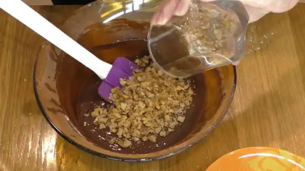 В тесто для второго коржа, добавьте какао-порошок и измельченные грецкие орехи.