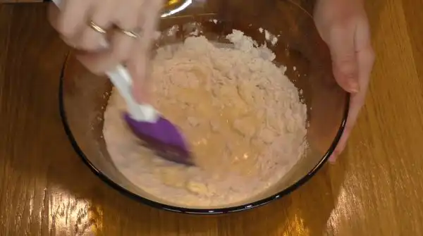 Просейте через сито муку со столовой ложкой крахмала и хорошо перемешайте тесто лопаточкой.