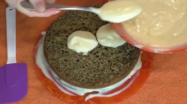 С хорошо остывших коржей нужно срезать твердую корочку и поочередно промазать коржи готовым заварным кремом.