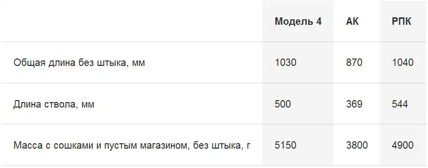Сравнение массогабаритных характеристик опытного автомата Судаева (Модель 4), автомата АК и ручного пулемета РПК :